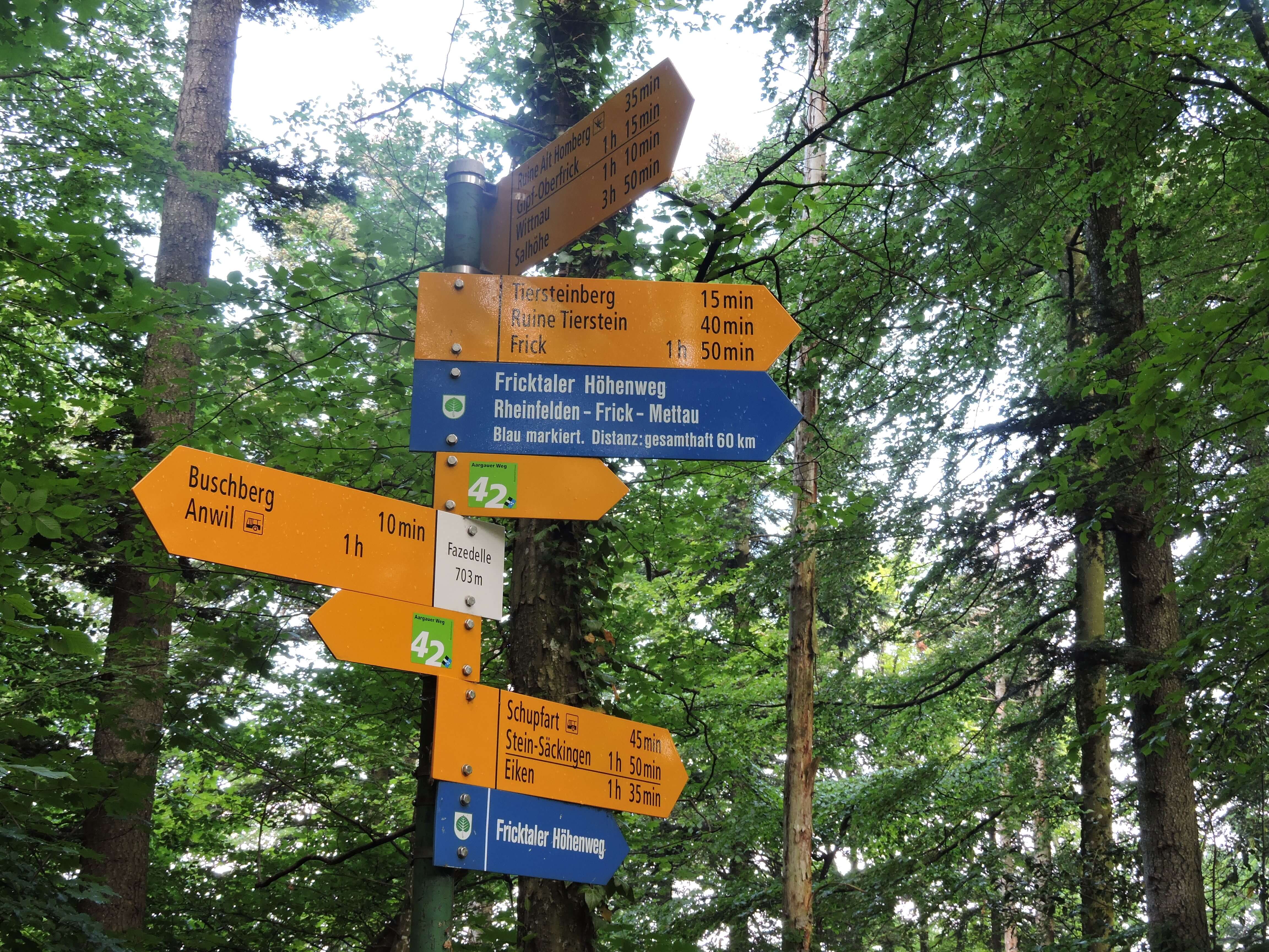 Kaum wo im Jurapark Aargau hat das Wanderwegnetz eine so prägnante Schnittstelle wie beim Fazedellenkreuz 703 m. Der Wegweiserstandort (Bild) zeigt die Routen in alle Himmelsrichtungen. Hier ist ein Wandernetz, das im Hochsommer über viele Kilometer schattige Pfade im Buchenwald bietet. Wer da in der Morgenfrühe oder nach einem reinigenden Gewitterregen unterwegs ist, kann den Kopf frei machen und voll durchatmen. Es bleibt aber nicht bei Wanderlust und Naturerlebnis. Das ganze Tafeljura-Plateau oder der nähere Bereich haben einiges an Besonderheiten zu bieten: Ausblicke von der Wegenstetter- und der Schupfarterflue, die Ruinen Alt Tierstein und Homberg, das Refugium Horn und die Buschbergkapelle. Auch zwei weiterführende Fusswege führen hier vorbei. Einmal der Fricktaler Höhenweg, welcher 1988 auf die Initiative von Max Mahrer, Möhlin eröffnete wurde und 4 Etappen vorgibt von Rheinfelden über Zeiningen, Frick bis Mettau mit 60 km Länge. Bei der Eröffnung wollte es der damalige Rheinfelder Stadtammann und Jurawanderer Molinari nicht bei mehreren Etappen bewenden lassen, er schaffte den Eröffnungsparcour an einem Tag. Wer unterwegs verweilen und auch in den Ortschaften Halt machen will, kann da schon beschaulicher ans Werk gehen. Ein zweiter von den Aargauer Wanderwegen markierter Weg, der ebenfalls hier vorbeiführt, ist der Aargauer Weg (Route 42). Er führt von Frick nach Aarau, weiter nach Brugg und Mellingen und endet in Bremgarten. Da sind der Jura und die Aare- und Reusslandschaft in ebenfalls vier Ertappen auf 89 km zu erkunden. Wer nur Teilstrecken unternehmen will, kann eine prächtige Rundwanderung (P Auto und Hinweistafel Wittnauerberg) auf dem Limpberg und dem Buschberg unternehmen. Selbst der Oe.V. führt nahe an die Wander-Arena mit Bushaltestellen in Anwil, Wegenstetten, Schupfart, Wittnau und Gipf-Oberfrick. Neu ist eine Bike-Route signalisiert, welche über 32 km von Frick nach Schupfart über Wegenstetten auf den Buschberg und nach Gipf-Oberfrick führt. Am erwähnten Wegweiser-Standort ist keine Signalisation zu finden, weil man sich bei diesem Projekt sehr darum bemühte die Bike-Route wohl auch an viele erwähnte Fixpunkte zu führen, aber das Wanderwegnetz so wenig als möglich zu tangieren. Bike-Karte und viele Unterlagen zum Wandergebiet sind bei info@jurapark-aargau.ch , Geschäftsstelle in Linn 51, 5225 Bözberg erhältlich.