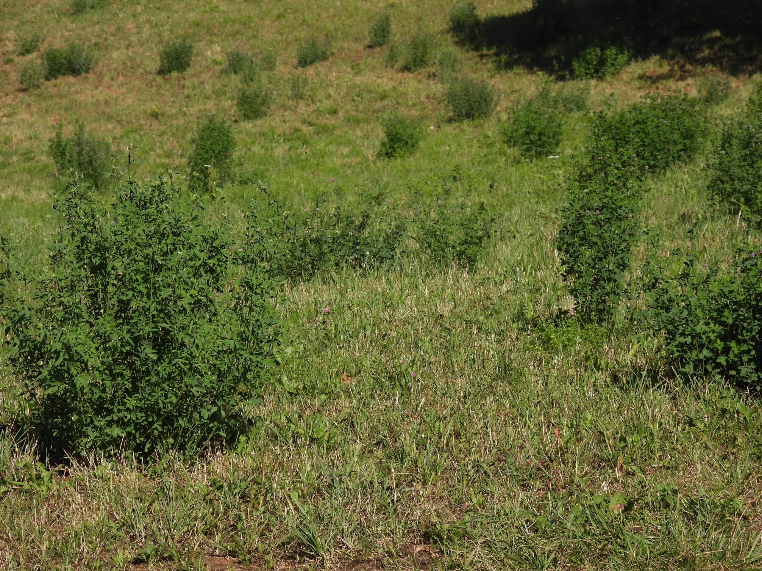 In der 30. Kalenderwoche wurde diese Wiese gemäht. Jetzt, wie die Aufnahme vier Wochen später zeigt, ist es rundum immer noch weitgehend dürr und trocken. Nur dank Gewitter ist ein wenig Wachstum erkennbar. Aber eine Pflanze dominiert klar. Unbeirrbar reckt sie sich höhenwärts. Sie erinnert mich an die Trockenperioden in meiner Jugendzeit, wo unser Landwirtschafts-Betrieb an den Südhängen Mühe hatte etwas Futter einzubringen. Da setzte der Vater immer auf die «Überlebensvariante» für die Ernährung der Milchkühe, auf einen grösseren Luzerne-Acker. Den Maisanbau als Alternative gab es damals noch nicht. Die Luzerne schon, sie soll schon in Persien als wichtige Futterpflanze für die Pferde zum Einsatz gekommen sein und wurde um etwa 470 v. Chr. nach Griechenland gebracht. Die spanischen Kolonialherren beglückten Peru und Mexico damit, und aus Italien sollen die Waldenser aus dem Lusernatal im Piemont die Verbreitung auch im nördlichen Europa ermöglicht haben. Ihre stickstoffbindende Fähigkeit verbessert die Leistungsfähigkeit landwirtschaftlicher Böden. Sie ist eine ergiebige Futterpflanze, dient meist als Silage und wegen hoher Bröckelverluste wird sie seltener als Heu geerntet. Sie wächst als überwinternd grüne, ausdauernde krautige Pflanze und erreicht Wuchshöhen von bis zu etwa 1 Meter. Sie besitzt ein tiefreichendes Wurzelsystem mit Rhizomen von über 4,5 Meter Ausdehnung. Das lässt sie ungünstige Niederschlagsperioden gut überstehen. Der aufrechte, mehr oder weniger beharrte Stängel ist vierkantig. Sie ist auch als Schneckenklee oder Ewiger Klee bekannt. Die Blüten werden stark von Hummeln besucht. Die Samen werden aus den mehrsamigen, spiraligen, sich nur wenig öffnenden Hülsen durch den Wind herausgeschleudert. Die Pflanze verwildert beständig; dann besiedelt sie Wegränder, ruderal werdende Halbtrockenrasen und Trockenwiesen. Die Luzerne gedeiht am besten auf tiefgründigem, etwas kalkhaltigem, aber nur mässig nährstoff- und humusreichem Lehm- und Lössboden. Die «Medicago sativa» blüht bläulich bis violett, purpurfarben oder weiss. Die Blütezeit reicht vom Juni bis September.