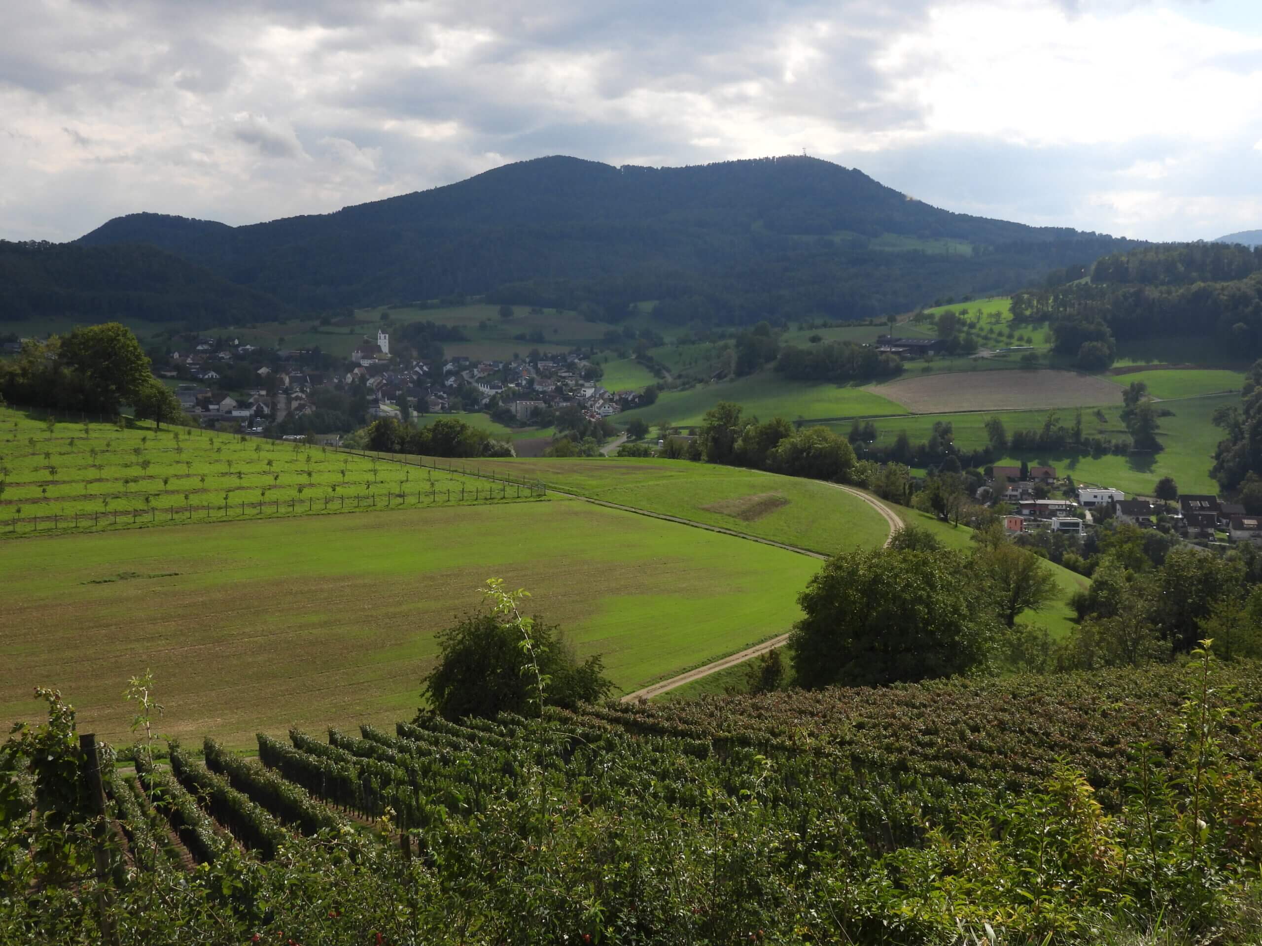 Ueken liegt 400 m.ü.M. Wie in vielen Talgemeinden macht der Verkehr zu schaffen, der sich durch das dichte, geschlossene Strassendorf quält. Die Staffeleggstrasse ist die meist befahrene Pass-Strasse im Aargauer Jura. Um Entlastungen wird zu Recht gerungen, vor allem was diese Ausweichroute für Lastwagen auf der Linie Fricktal-Mittelland betrifft. Gibt es dennoch taugliche Rezepte für Wanderlustige und die Erholung im Nahbereich? Wie in vielen Seitentälern des Fricktals lohnt sich oft ein Abstecher in die allernächste Umgebung. Ein solcher lässt sich auch in Ueken buchstäblich vor der Haustür finden. Sie gehen oder fahren nach dem Wegweiser an der Hauptstrasse Richtung Rebsiedlung Egg, Gebiet Langewand oder Steinrieselten. Gut 150 Meter geht es durch das enge Tälchen höhenwärts und schon sind sie, wie das Bild zeigt, auf einem Hochplateau, das man dank dem weiträumigen Strassen- bzw. Feldweg-Netz als Wander- oder Spazierarena leicht begehen kann. Direkt auf Egg führt der Weg durch lichte Föhrenwälder oder hinauf zum «Feldherrenhügel» bzw. dem Wasser-Reservoir, welches hart an der Banngrenze bereits zur Gemeinde Hornussen auf der anderen Talseite liegt. Nun beim grossen Feldkreuz mit Ruhebank unsere Sicht nach Süden. Ein eindrückliches Rebbaugebiet liegt direkt rund um uns. In unmittelbarer Nähe befindet sich eine Geflügelfarm, wo offensichtlich für das Federvieh viele grosse Freiheiten bestehen. Jedenfalls dank dem «Raus-Programm» in den weiträumigen Auslauf. Eine grosse Anzahl Nussbäume ist angepflanzt. Sie werden zunehmend Schatten spenden. Die Kombination «Nuss und Ei frisch vom Hof» ist jedenfalls einladend und das Tierwohl scheint hier beste Voraussetzungen zu haben. Voraus im Talgrund ist ein Teil der Gemeinde Ueken zu sehen und direkt Richtung Staffelegg die Nachbargemeinde Herznach. Der Zusammenschluss dieser beiden Gemeinden hat die Zustimmung der Bürgerschaft gefunden. Die renovierte Kirche St. Nikolaus auf dem dominanten Hügelzug rundet unsere Aussicht ab. Gleich dahinter markieren die drei Strihen die Horizontlinie (v.l.): der Wölflinswil bringt es auf 865 m.ü.M, der Asper auf 838 und in der Mitte der Densbürer, als höchste Erhebung im Aargau, die sich vollständig im Kantonsgebiet befindet mit 867 m.ü.M. Wer die Karte studiert, wird rasch weitere vergleichbare Naherholungsräume finden. Es lohnt sich!